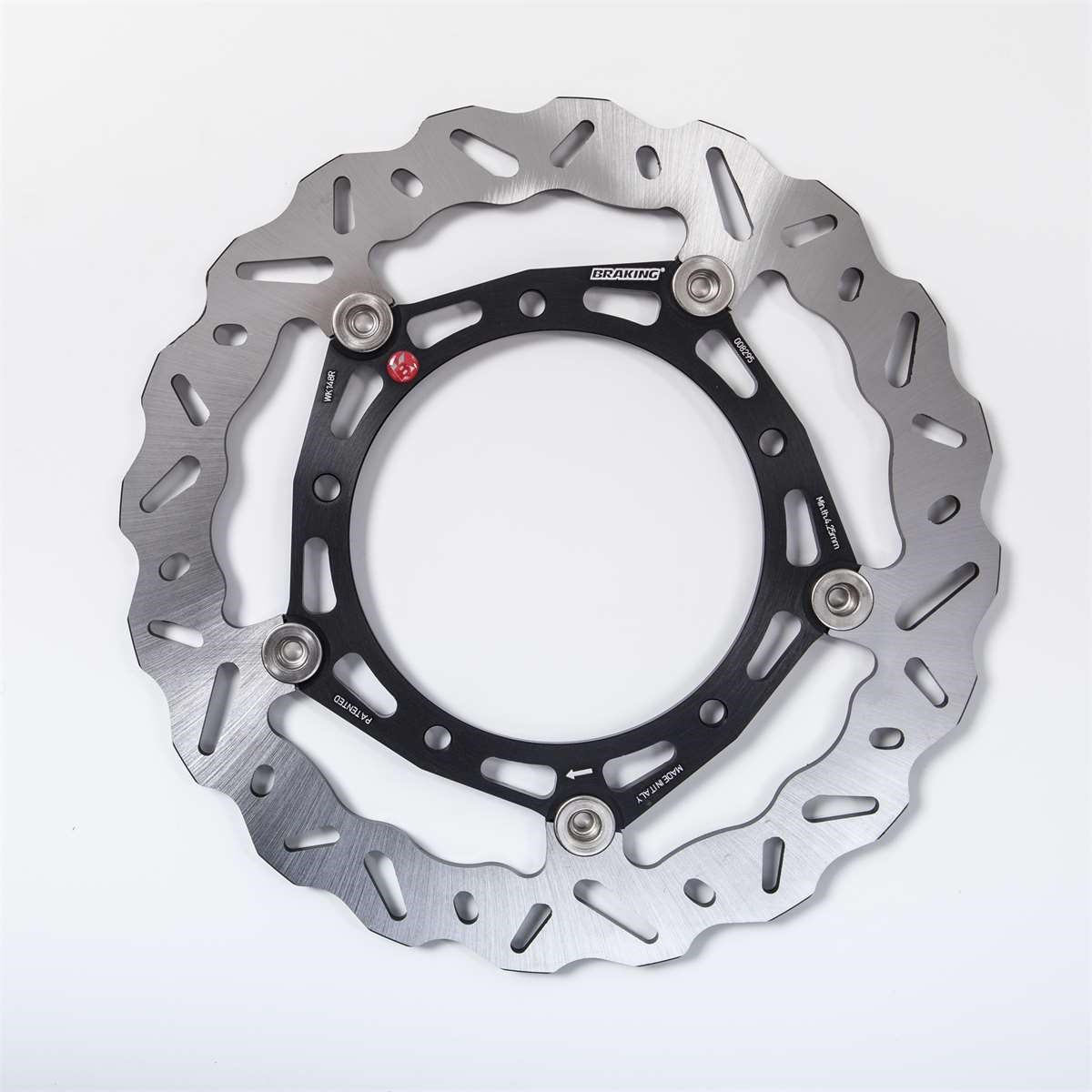 Bremsscheibe vollschwimmend mit gelochtem Stahlaussenring im Wave Design, Innenring aus Aluminium.