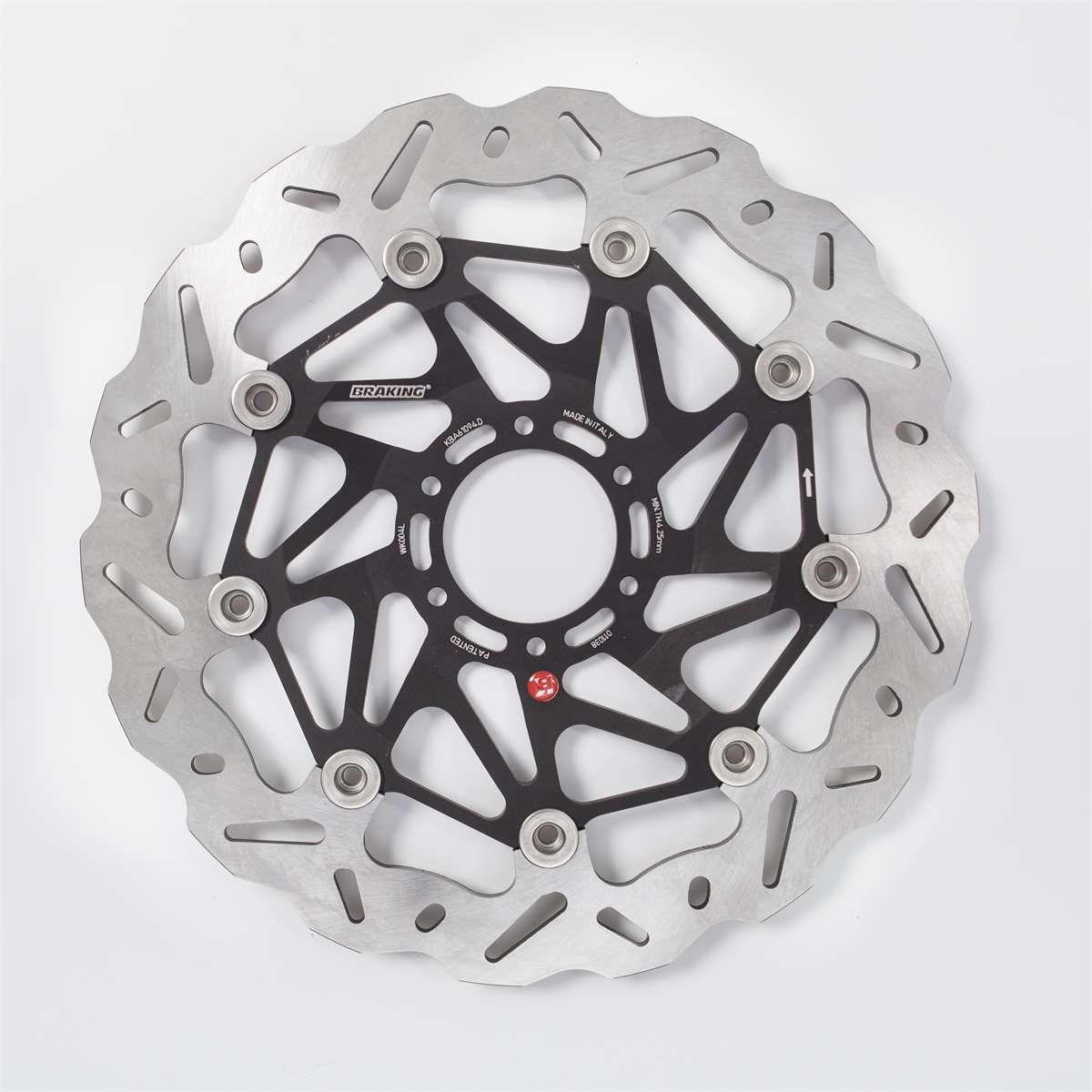 Bremsscheibe vollschwimmend mit gelochtem Stahlaussenring im Wave Design, Innenring aus Aluminium.