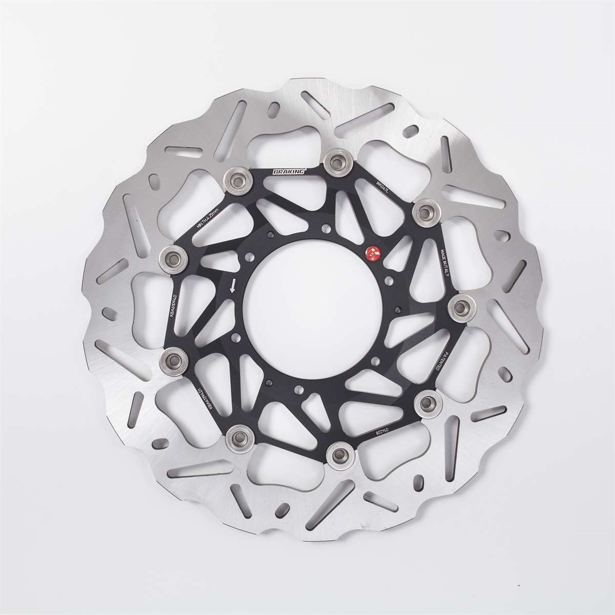Bremsscheibe vollschwimmend mit gelochtem Stahlaussenring im Wave Design, Innenring aus Aluminium.