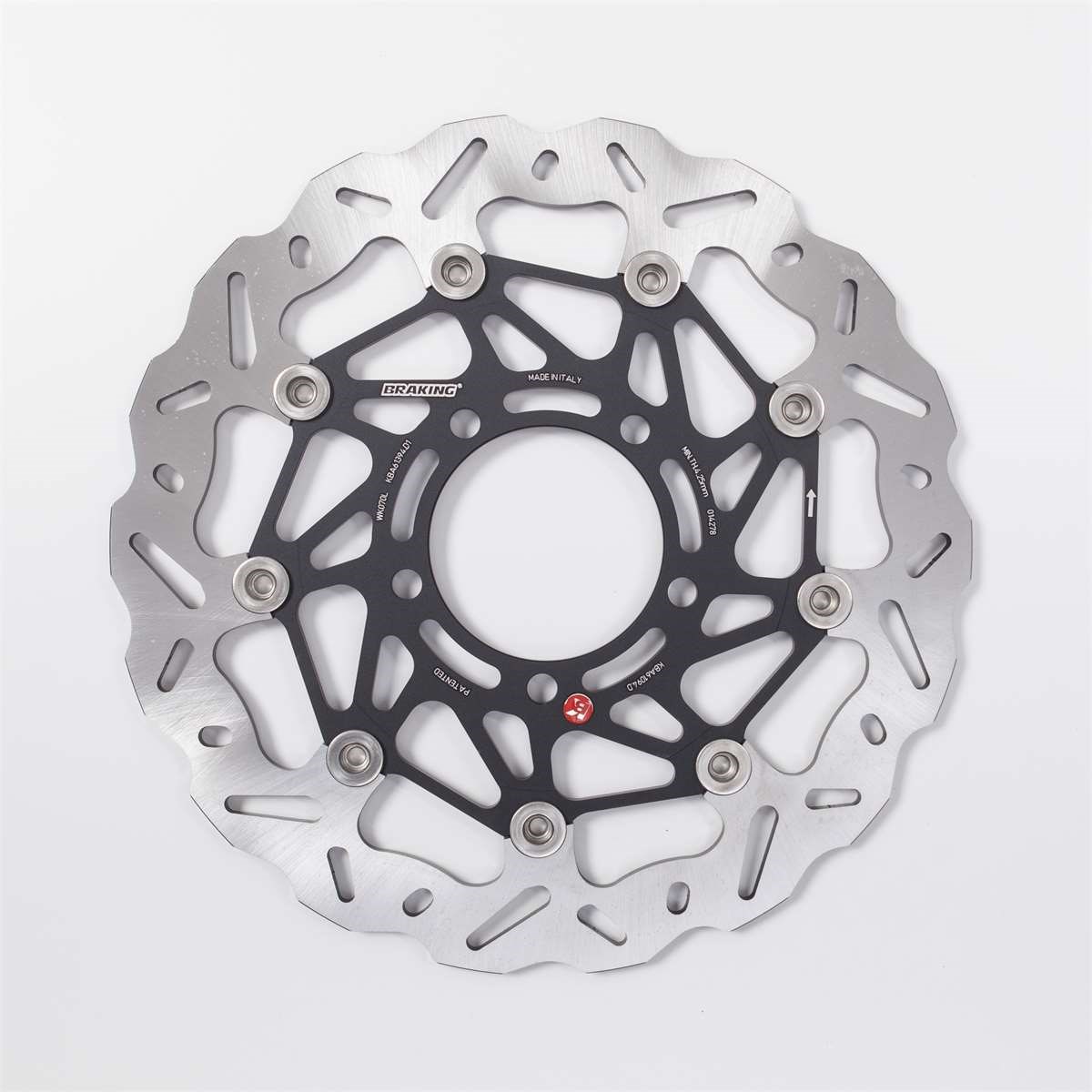 Bremsscheibe vollschwimmend mit gelochtem Stahlaussenring im Wave Design, Innenring aus Aluminium.