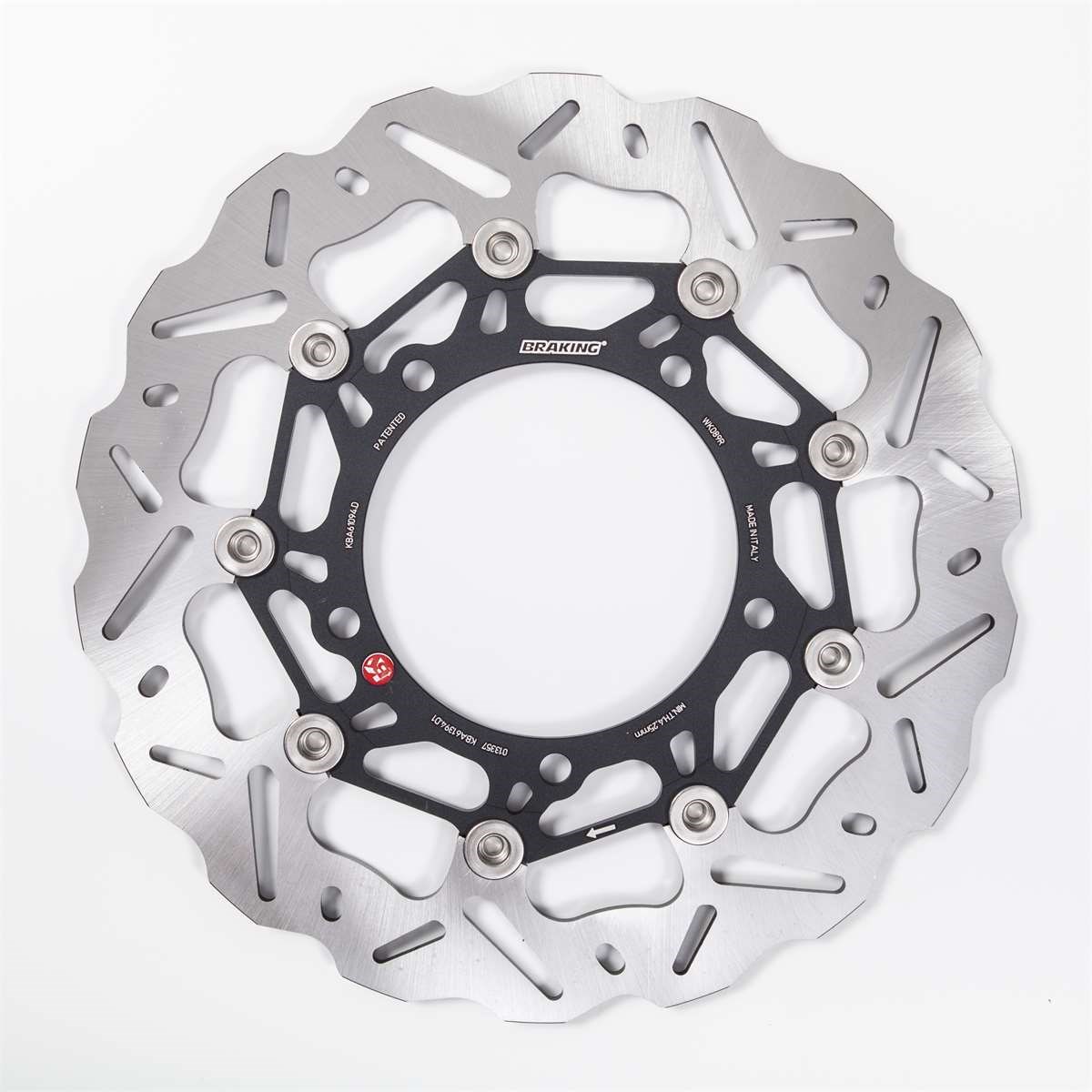 Bremsscheibe vollschwimmend mit gelochtem Stahlaussenring im Wave Design, Innenring aus Aluminium.