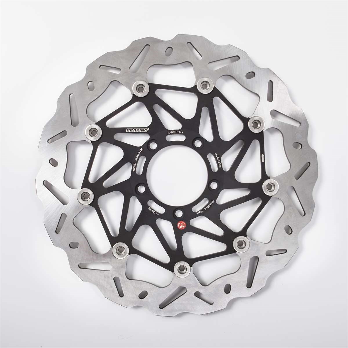 Bremsscheibe vollschwimmend mit gelochtem Stahlaussenring im Wave Design, Innenring aus Aluminium.