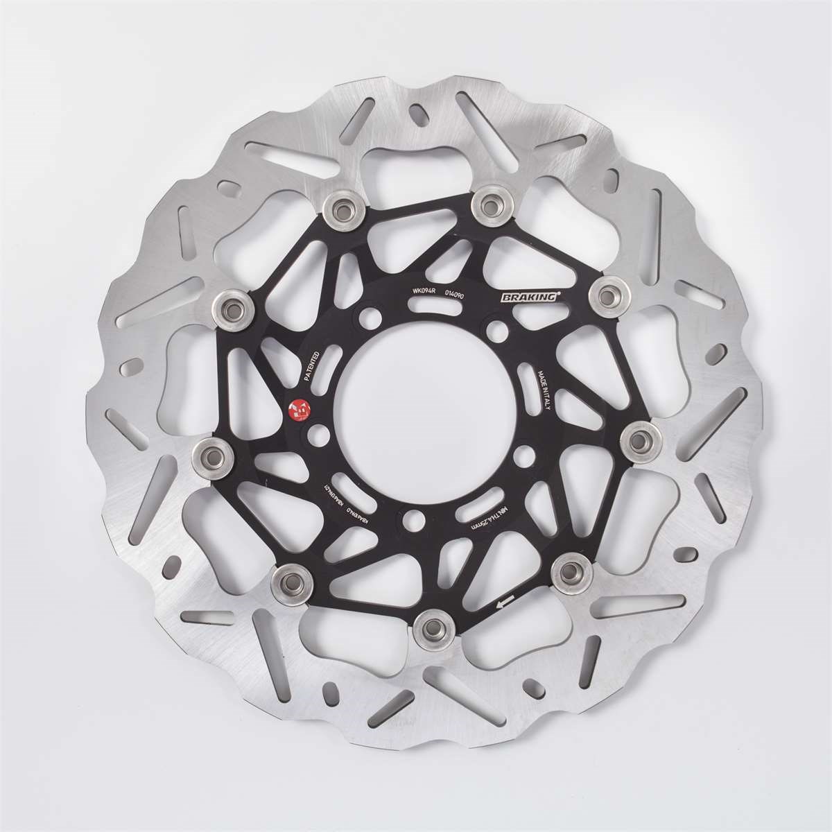 Bremsscheibe vollschwimmend mit Stahlaussenring im Wave Design, Innenring aus Aluminium.