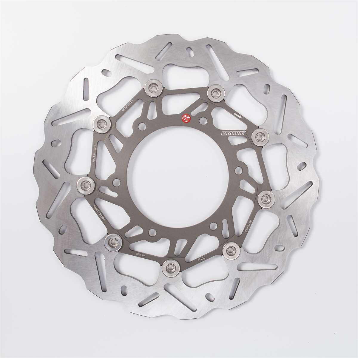 Bremsscheibe vollschwimmend mit gelochtem Stahlaussenring im Wave Design, Innenring aus Aluminium.