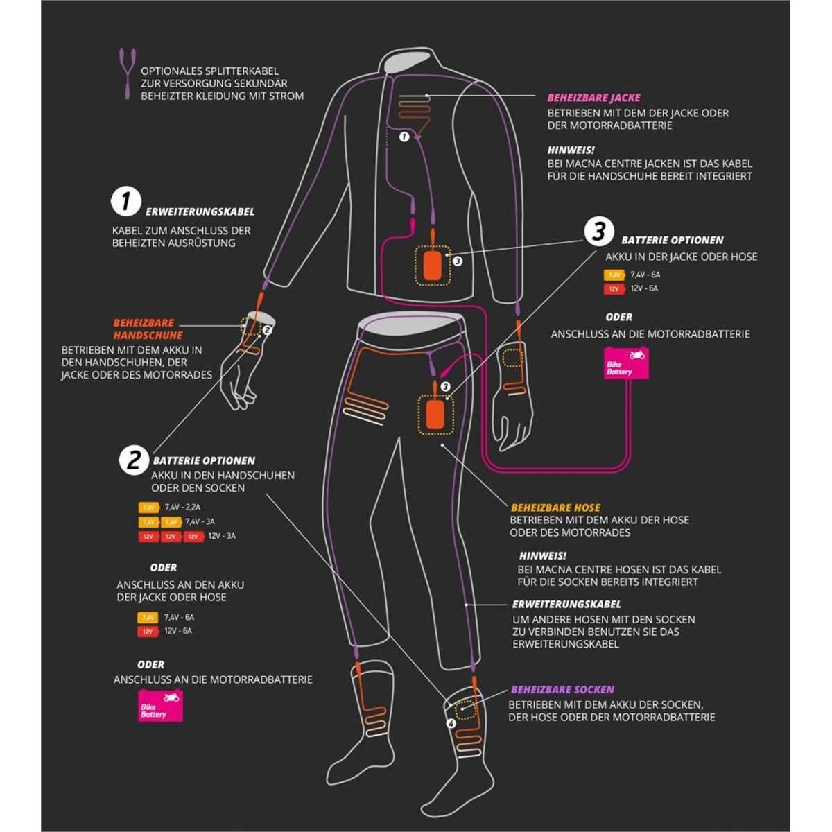 Die Hose kann entweder allein, oder zusammen mit der Heiz-Textiljacke betrieben werden. Die Stromversorgung erfolgt entweder direkt über das Stromnetz des Motorrades, oder über das separat erhältliche Akku-Pack. Die Heizleistung steuerst Du über die MACNA Heatet App.