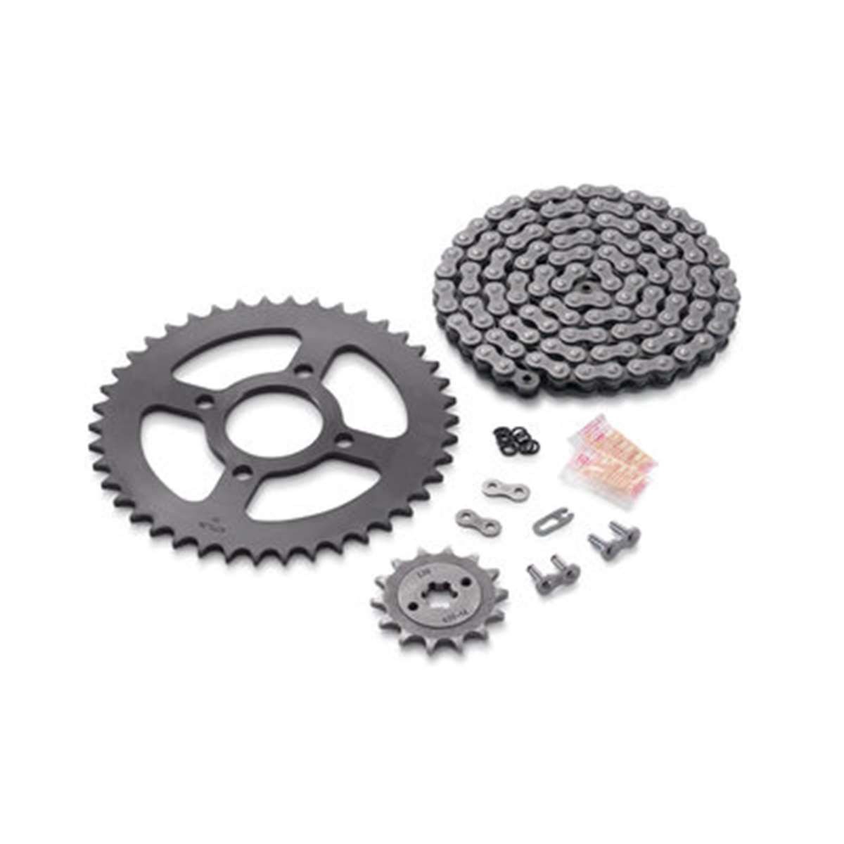 Der Antriebssatz besteht aus dem vorderen (14 Zähne) und dem hinteren, schwarzen Kettenrad (48 Zähne), einer DID-Kette und einem Kettenschloss.